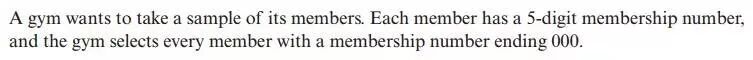 题目中说,健身俱乐部的成员都有一个5位数的编号,现在选取最后三位数是000的成员进行调查统计,所以每个被抽中的人编号间隔应该是1000,相当于是等距分布,故是系统抽样(systematic sampling)。