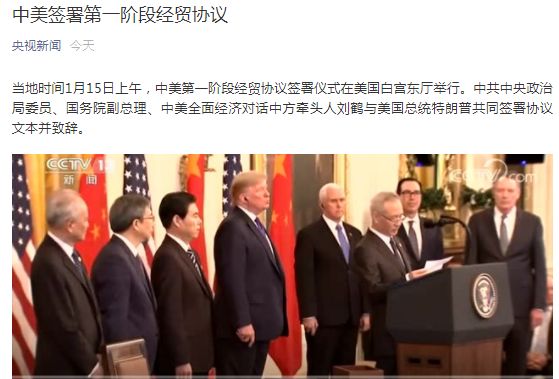 当地时间1月15日上午,中美第一阶段经贸协议签署仪式在美国白宫东厅举行。中共中央政治局委员、国务院副总理、中美全面经济对话中方牵头人刘鹤与美国总统特朗普共同签署协议文本并致辞。